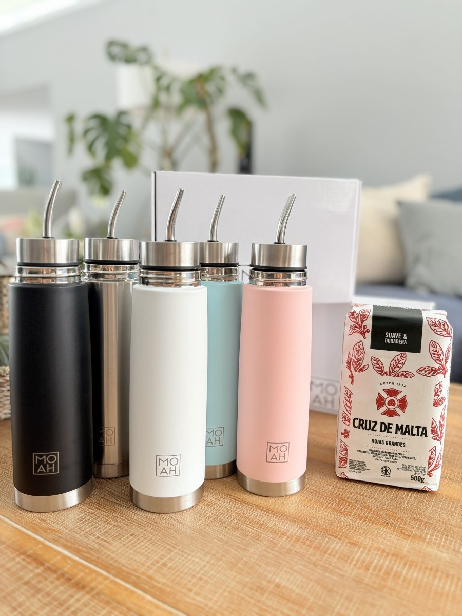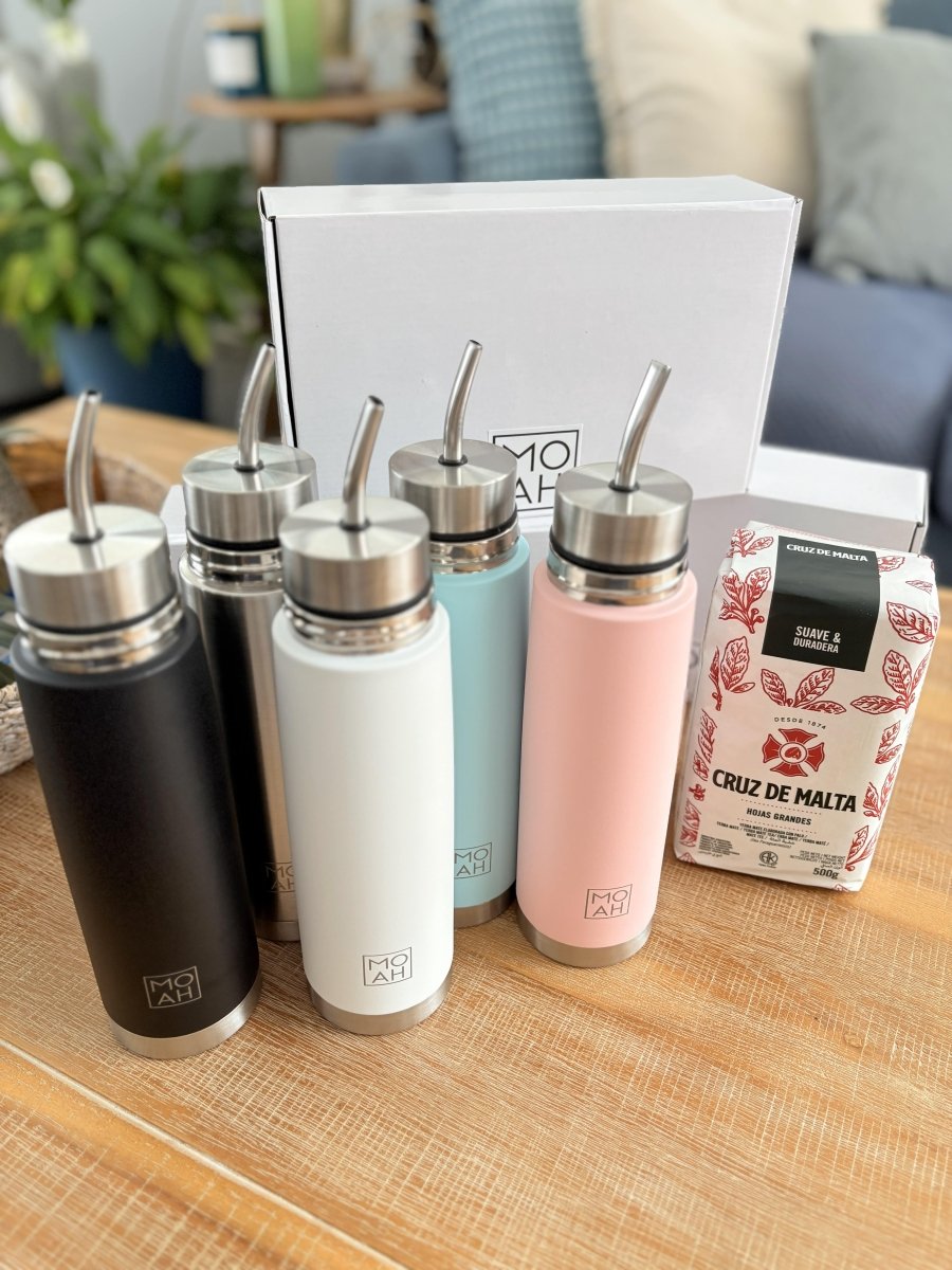 MOAH Buenos Aires Stainless Steel Self-Pouring Mate Flask Kit 500 ml (Mate Autocebante): a modern take on the classic mate flask, this sleek stainless steel kit merges style and function - flask, mate cup and straw all in one. With a self-pouring lid, double-wall insulation to keep your mate hot or cold for hours, and a compact design perfect for your daily commute or outdoor adventures, this flask makes it easier than ever to enjoy mate mess-free and on the move. Includes both a regular screw top and autocebante lid for versatile use.